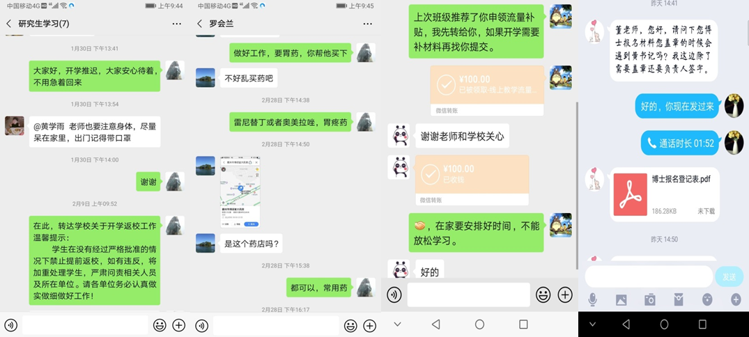 除了通过“云组会”加强对研究生学习科研指导,学校前四周已开课的179门研究生课程均顺利推进线上教学,其他175门研究生课程均已做好线上教学准备。此外,各学院(学部)坚决落实学校各项防控要求,及时做好各类信息报送,切实关心关爱每一位研究生身体健康和学习科研。信息工程学院副院长黄学雨:“我们学院及时落实疫情防控各项要求,相关人员各负其责,研究生秘书董丽凤老师每天及时了解反馈学生健康情况,对身体不适的同学,及时登记信息,给予关心和指导,并给予跟踪,直到康复。及时给予线上教学手机流量不足的同学发放线上教学流量专项补贴;给予疫情期间留校研究生发放生活补助;留校研究生出现身体不适的,积极帮助购买对症药品,帮助考博同学办理报考资料盖章等。”