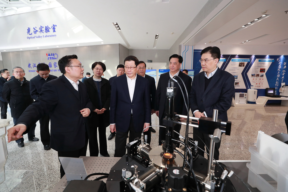 应勇在华中科技大学党委书记、湖北光谷实验室主任邵新宇,华中科技大学校长李元元等陪同下,来到华中科技大学引力中心、生命光电子研究平台、长飞光纤光缆公司、武汉光电国家研究中心,察看精密重力测量、生物医学成像等重大科技基础设施,听取光谷实验室运营和研究方向等介绍,详细了解科技成果应用领域以及产业化、市场开拓等情况。应勇指出,湖北的光电基础研究和光产业优势明显,要进一步整合资源,加强光电子技术应用,加快成果转化步伐,推动“光芯屏端网”等战略性新兴产业实现突破发展。要积极参与国家重大科技专项,聚力攻关“卡脖子”技术,为国家科技自立自强贡献湖北力量。