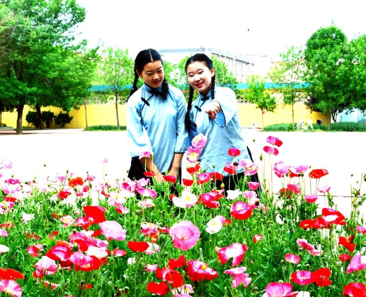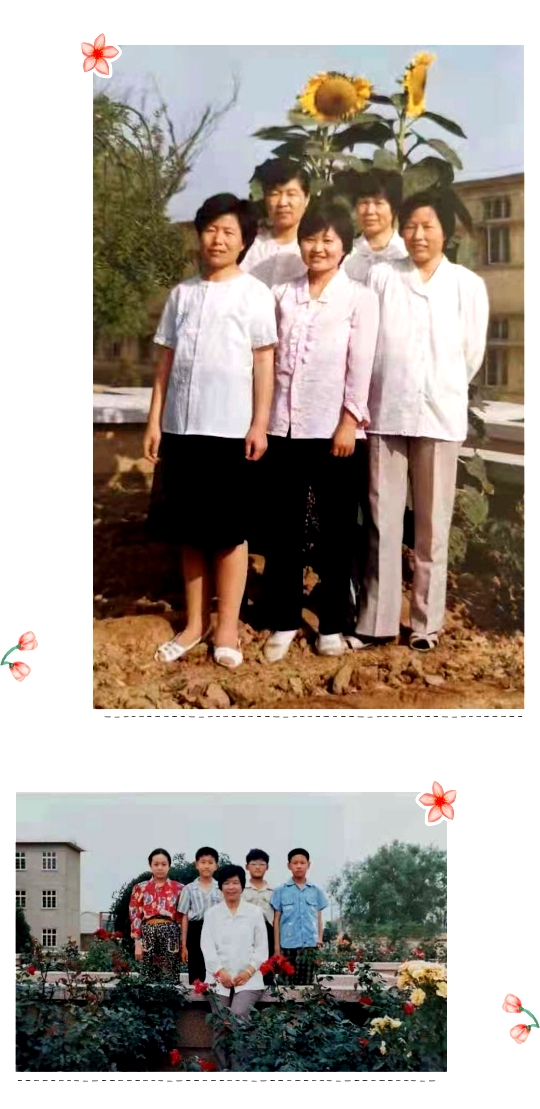 照片景物说明:这两张照片是退休的何金芳老师和四个同学的合影;郭芳丽、薛林萍等四位老师的合影,背后是一丛正在开放的向日葵,花坛下面是泥土的地面,坎坷不平,也说明当时的办学场地条件较差。这两张照片的背后教学楼就是原“羊口职工子弟学校”的学校旧貌,早已拆迁,现在的海化集团的“星域花园小区”就坐落于此。