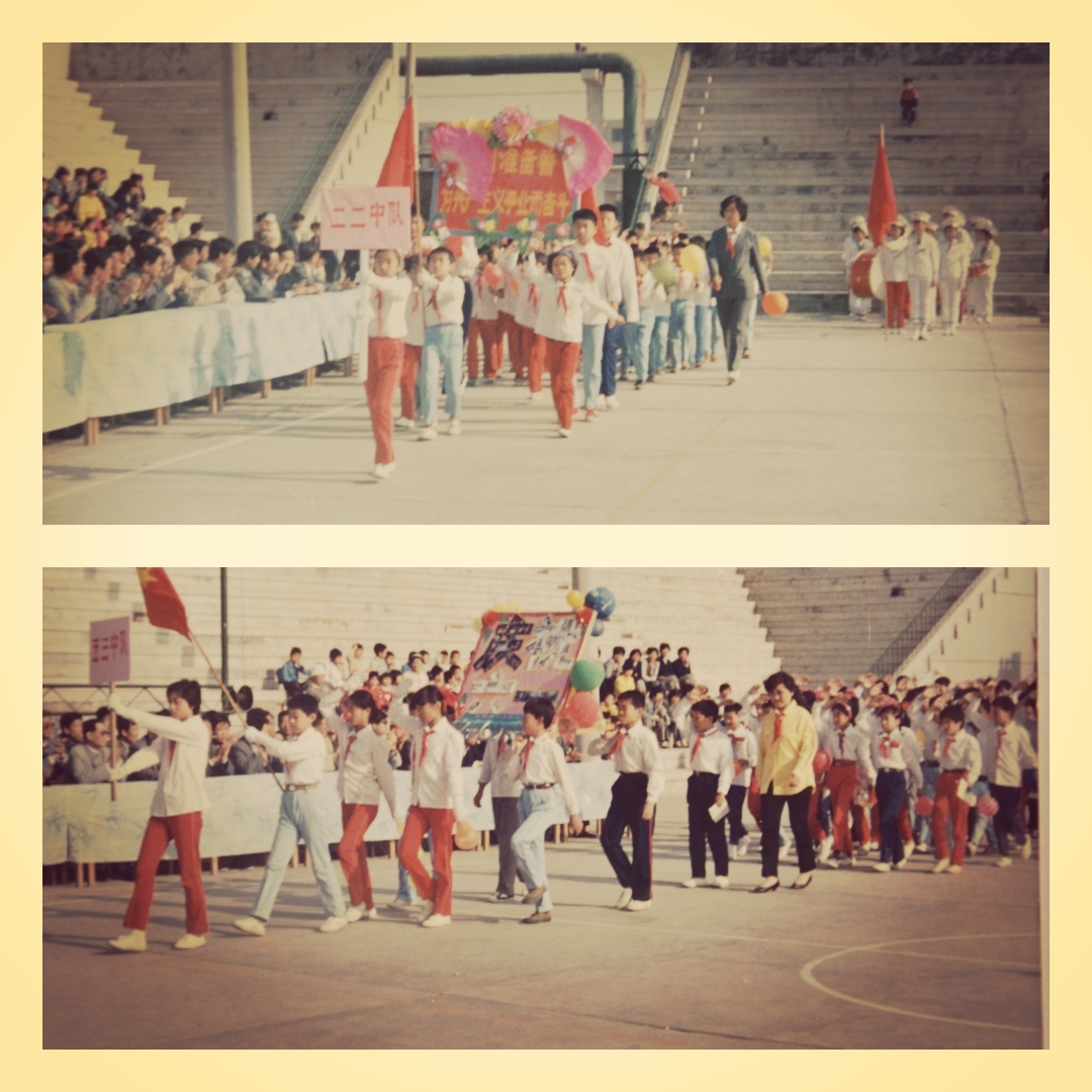 照片景物说明:这些阶梯结构的建筑物,是原潍坊纯碱厂的“职工体育灯光球场”,四周是由低到高的阶梯式座位,西北角和东南角各开设一门,共计两个出入的大门。可容纳数千人同时观看体育活动,每年学校庆六一文艺节目活动,组织营火晚会,少先队检阅式,我校的师生以及社会群众,皆汇聚于此前来活动,由于当时文化娱乐活动较少,每到演出时间,就会吸引周边农村的群众前来欣赏观看,热闹非凡。