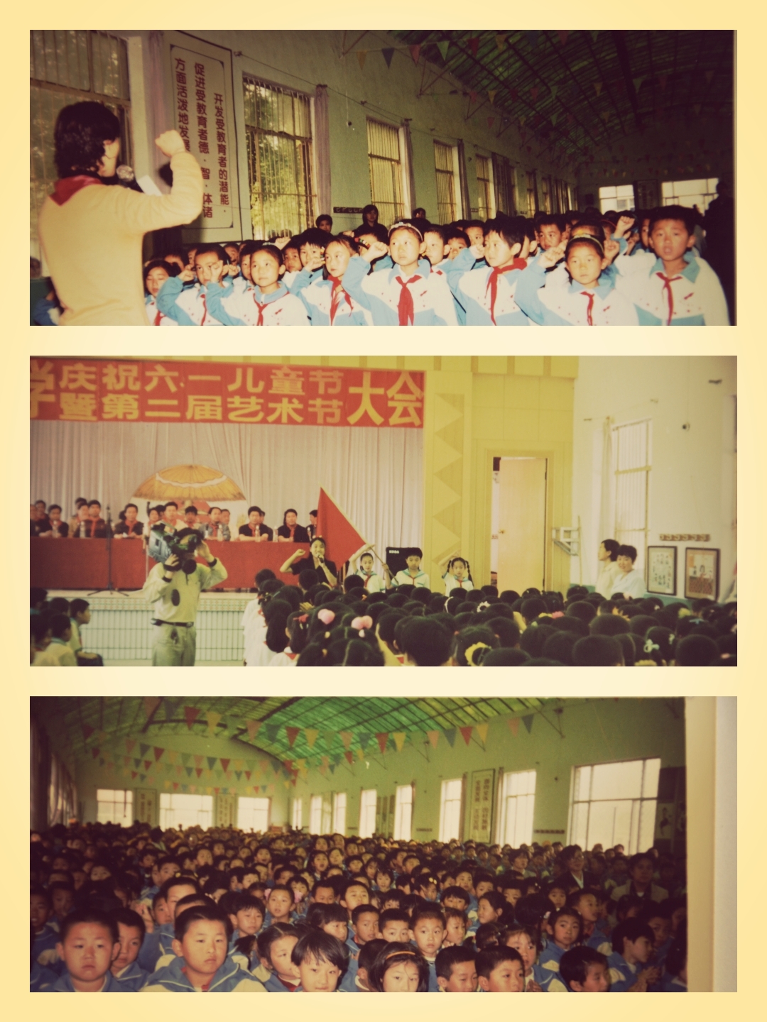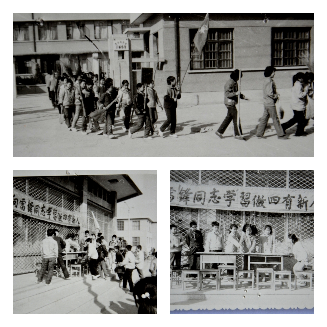 照片景物说明:这张黑白的照片,是30年前“潍坊纯碱厂子弟小学”的场景,在中队旗的引领下,少先队员们,手持大扫帚、扫地笤帚、铁锨等劳动工具,由校门口排着整齐的队伍,参加“学习雷锋纪念日”活动,校门口的上方,挂着一个方形的校牌,白底黑字书写着“潍坊纯碱厂子弟小学”,大门口使用推拉式手动的大门,大门口、教学楼、传达室都是用浅绿石粒水刷而成的,这也是30年前当时最流行的装饰材料。
