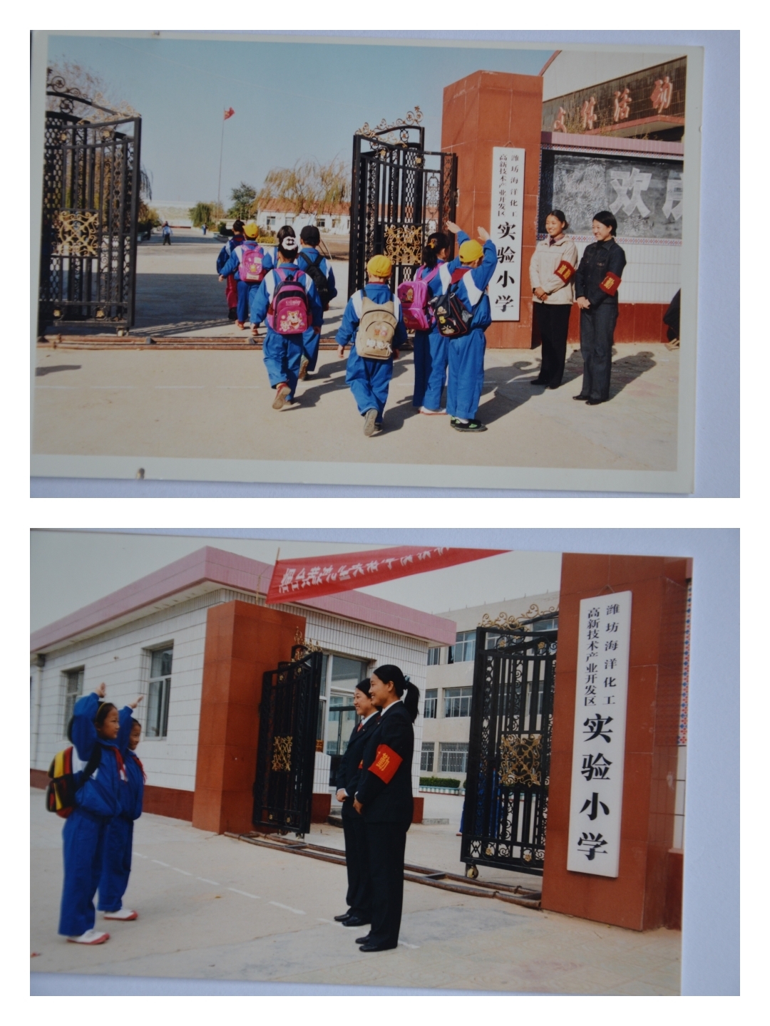 照片景物说明:这张“潍坊海洋化工高新技术产业开发区实验小学”是20年的学校名称,当时的大门口,用红色瓷砖镶嵌而成,大门口的铁门是黑色铸铁的,铁门低端安装滚轮,属于人工推拉式的。学校的王涛、张晓红老师手臂上佩戴着“执勤”标识,正在校门口值日,进入校门的学生,肩背书包,精神抖擞,先是向老师敬礼问好,老师面带微笑回礼,这场景亲切感人,文明和谐,学生身着的校服,书包,也成为20年前学生的外表记忆。