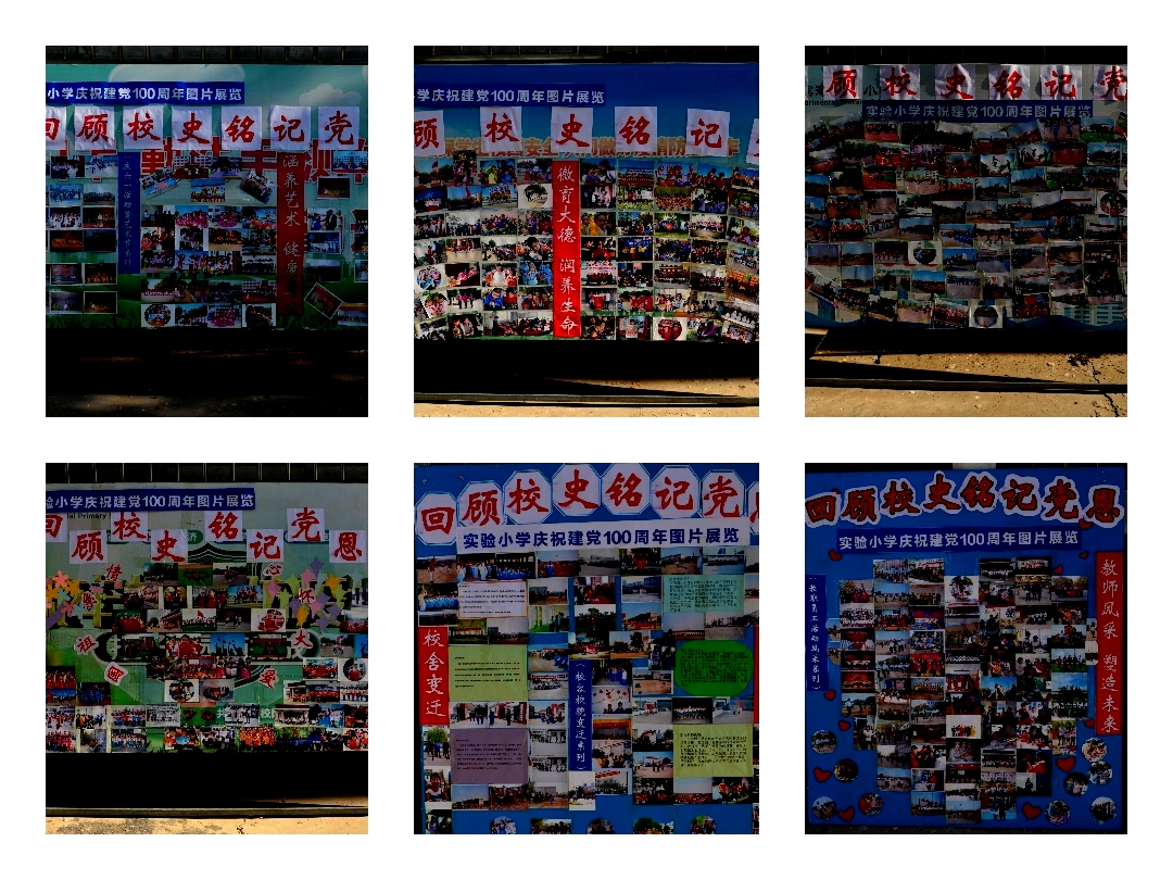 照片景物说明:这些照片中都有我校10年前、20年前的学校教学楼的颜色及外墙装饰材料,10年前我校教学楼统一使用淡粉色丙烯酸材料粉刷,20年前我校的教学楼墙面为淡绿色石子水刷工艺处理,今天的教学楼统一用淡暗红赭石设色的工艺处理,并在窗口处处理白色镶嵌,整体方格点缀,醒目而富有蕴含,大方而富有生机。