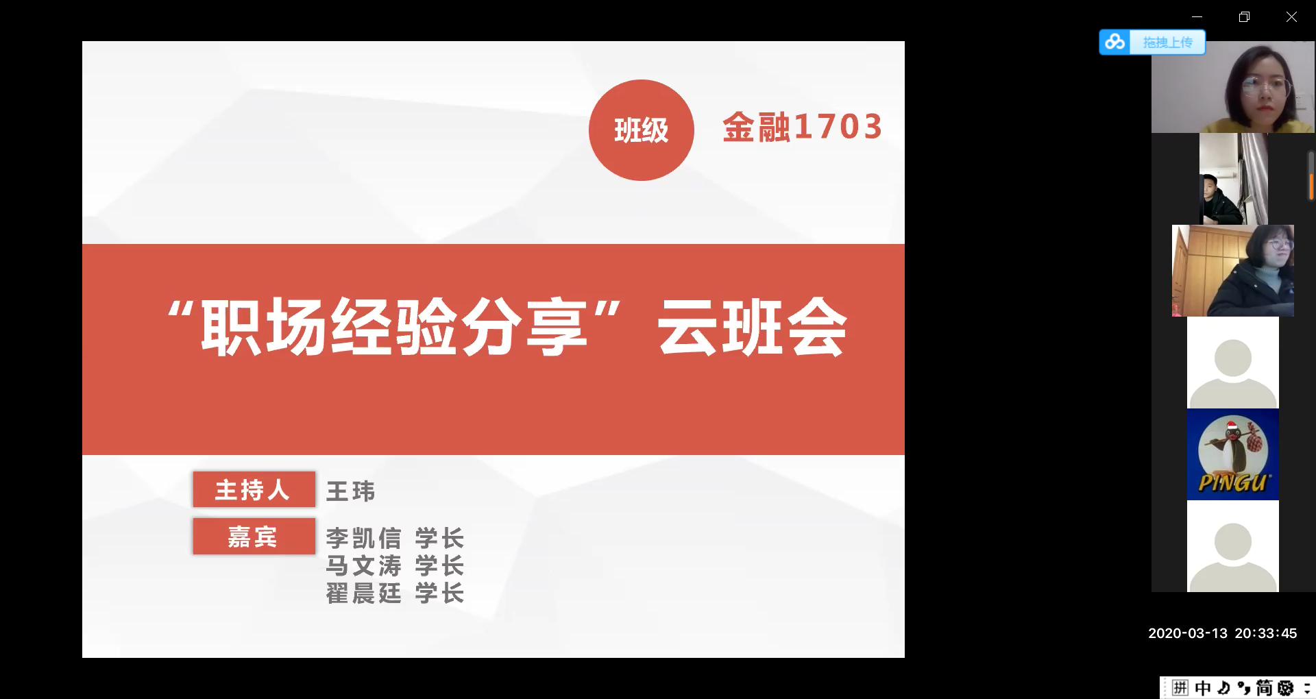 金融管理学院研究生毕业班“云班会”邀请到了3位校友导师参与,作为学长学姐,校友导师为同学们分析疫情形势下的行业就业情况,为他们毕业求职进行入职前、入职后的职场经验交流。校友导师加盟“云班会”,让毕业班同学们大呼意外,“云班会”开成了求职分享会,校友导师解答了面临毕业的毕业生们的很多疑惑。