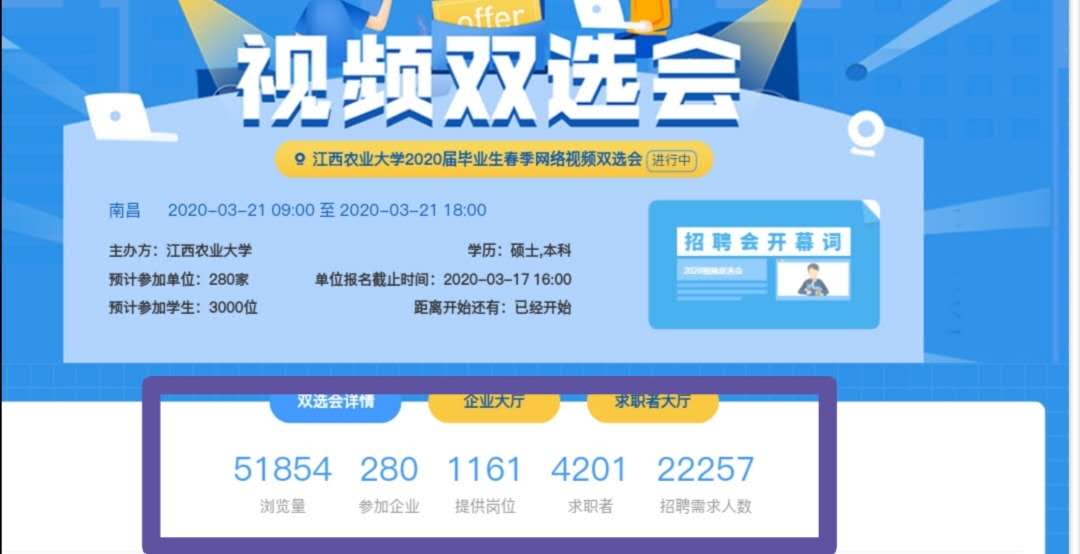 据悉,为做好此次视频双选会,学校充分利用网络资源和平台,对参会企业资质进行了严格筛选,提高了用人单位质量;结合毕业生专业需求,按企业性质进行了岗位分类,提高了毕业生择业的针对性和精准度;扩大了本省企业的参会数量,积极推动毕业生留赣就业;为湖北籍毕业生精心邀请和挑选了多家当地优质企业,体现了学校对疫情重点地区毕业生的关心关爱。