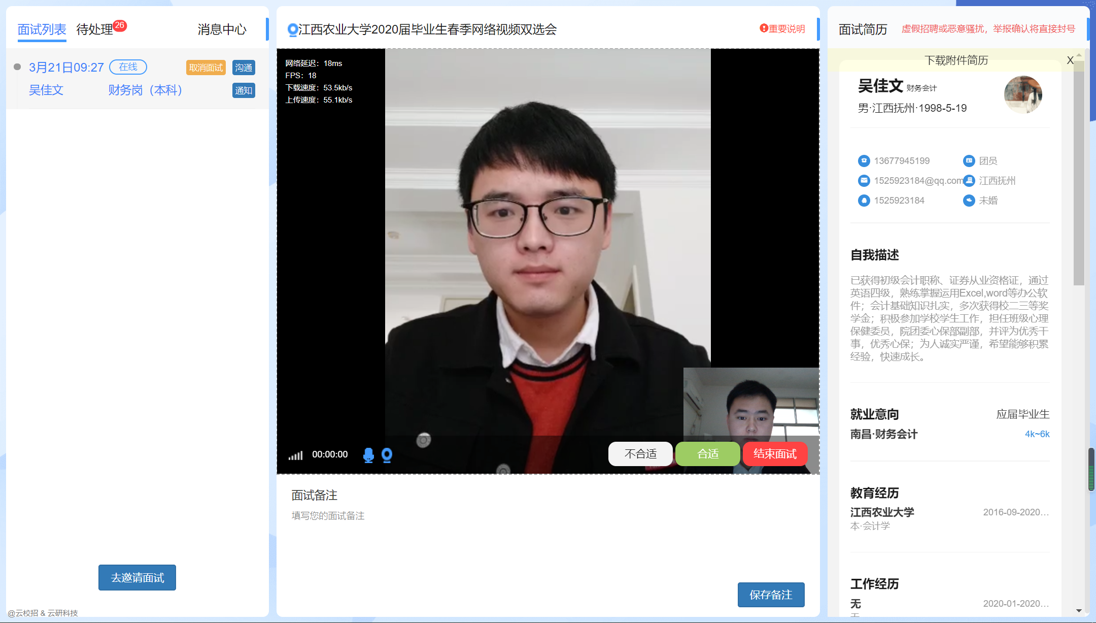 本次视频双选会通过利用云就业网络平台,做到了毕业生和用人单位线上投看简历、视频面试、互动交流的充分结合,真正实现了企业和学生“足不出户”即可完成招聘的良好效果。截止当天下午3时,统计数据显示线上浏览量高达51854人次,毕业生求职人数4201人,投递简历12098人次。网络视频招聘形式得到了用人单位和毕业生的广泛关注和充分肯定,正邦集团有限公司负责人表示,公司与我校长期保持良好的人才合作关系,感谢学校此次视频招聘发出的邀请和提供的平台,帮助他们有效缓解了用人之急;经管院武汉籍毕业生熊同学表示,网络视频招聘会很及时、很新颖、很实用,感谢学校在疫情防控期间对毕业生的关心牵挂,对自己落实好就业去向充满信心。