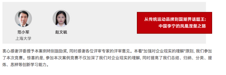 在本轮评选中,金晓玲副教授及其团队开发的《微医:重塑就医流程的战略布局》案例以新兴信息技术快速发展、人们对医疗的需求日益增加,特别是2020年COVID-19疫情爆发为大背景,以缓解医疗资源不平衡、疏解用户焦虑情绪、减少患者交叉感染风险为目标,围绕微医为用户提供医药保生态系统的过程,探讨如何根据行业特点和用户需求寻找医疗健康行业的新“蓝海”、如何利用技术和管理手段来解决互联网医疗APP的初始信任难题以期获取用户基础等问题。范小军教授及其团队开发的案例《从传统运动品牌到国潮界话题王:中国李宁的凤凰涅槃之路》通过分析李宁成立、登顶、跌落、再爬升的过程,探讨老国牌如何改变老旧过时的品牌形象,如何实现品牌的国际化,实现创新的同时保持传统;从而为我国传统企业的发展提供借鉴意义。
